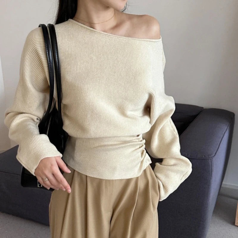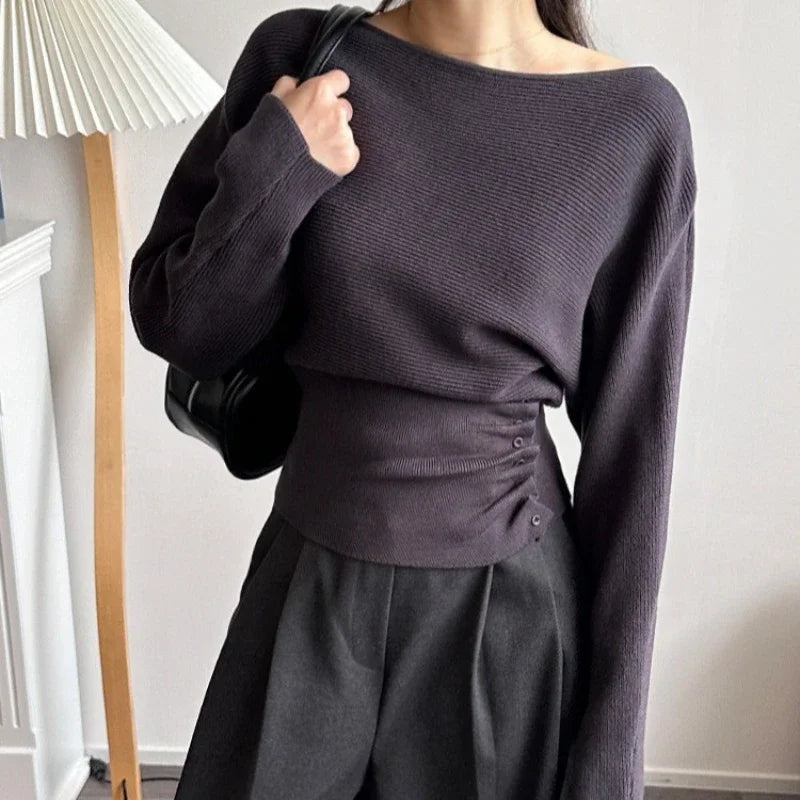 2025 Women Wrinkled Button Waist Pullovers Off Shoulder Slash Neck Autumn Winter Knitted Sweater Long Sleeved Knitted Tops