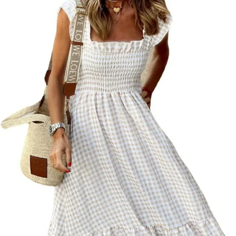 Elegant Plaid Slip Maxi Long Dress Summer Women Strapless Ruffle Backless Pleated Elastic Waist Boho Party Swing Loose Dresses