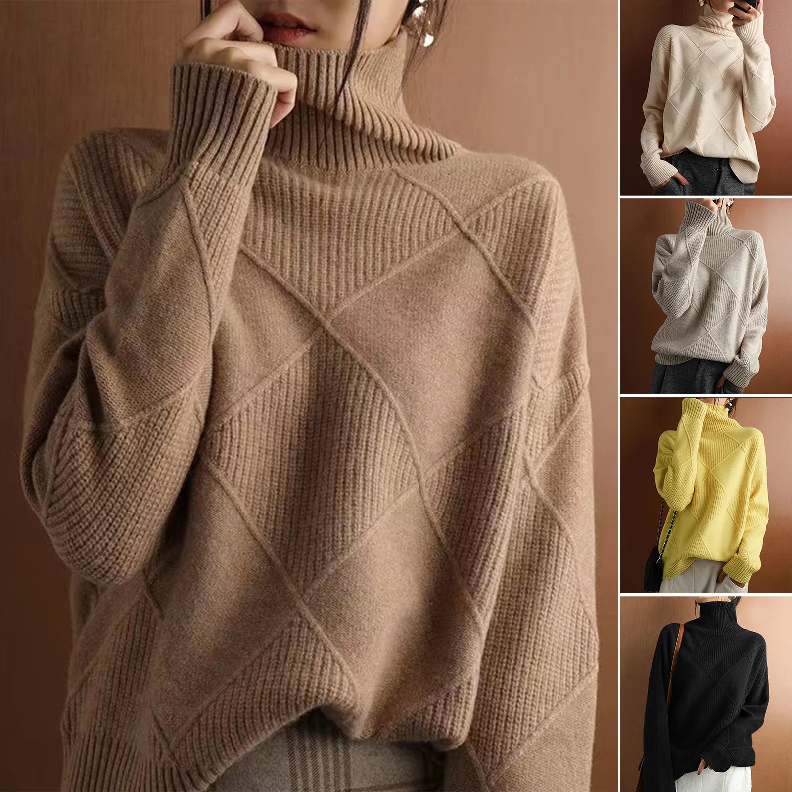 Cute Patchwork Design: Embrace comfort and style with this loose sweater featuring trendy patchwork, a relaxed silhouette, high collar, long sleeves, and a charming cable knit pattern for a fashionable yet cozy look.