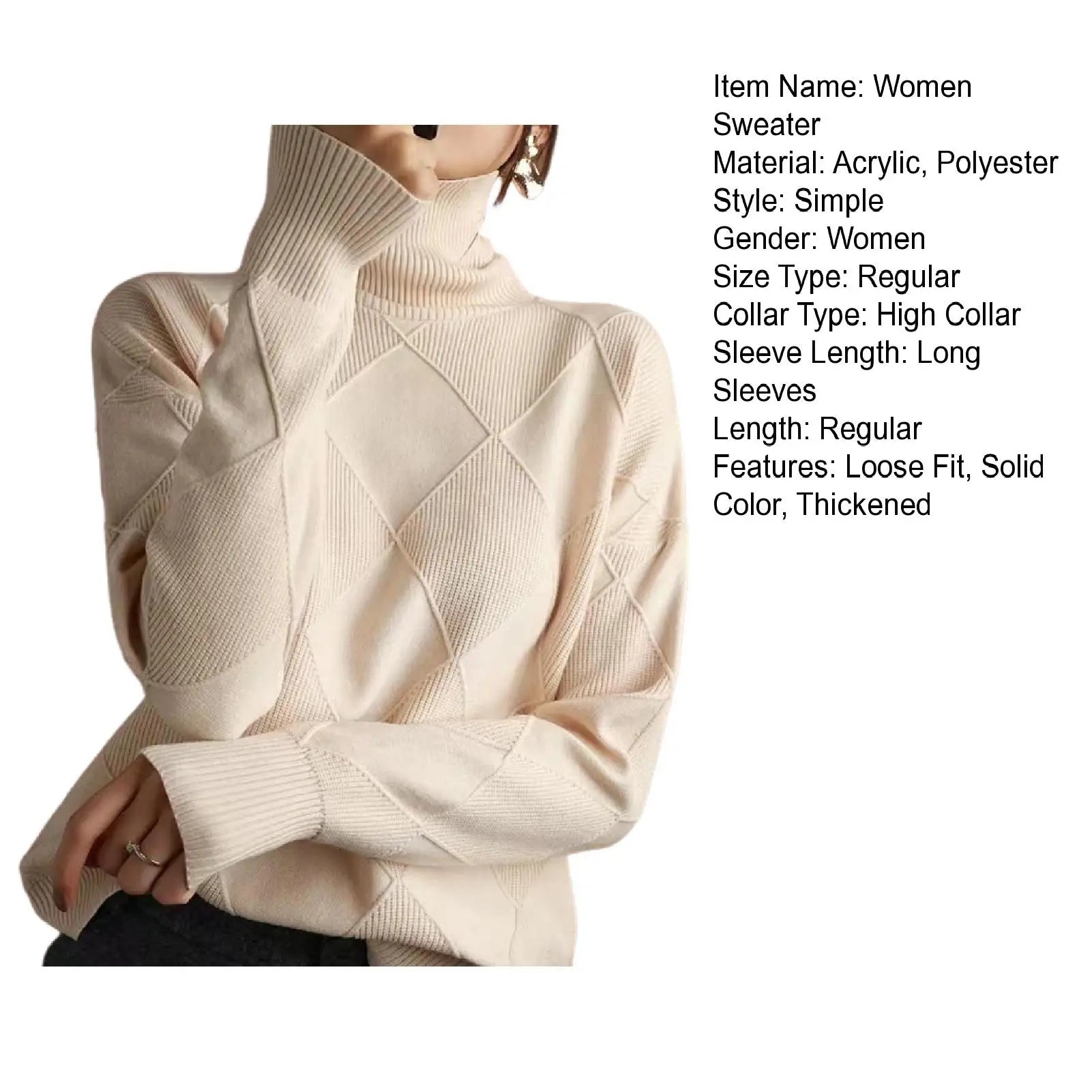 Women Sweater High Collar Long Sleeve Crochet Texture Solid Color Pullover Tops Loose Fit Thickened Warm Knitwear