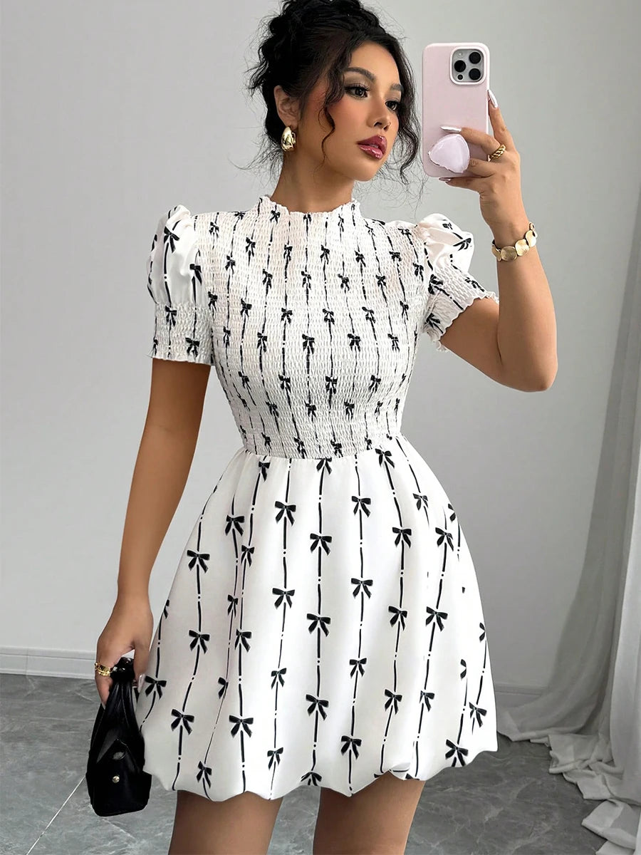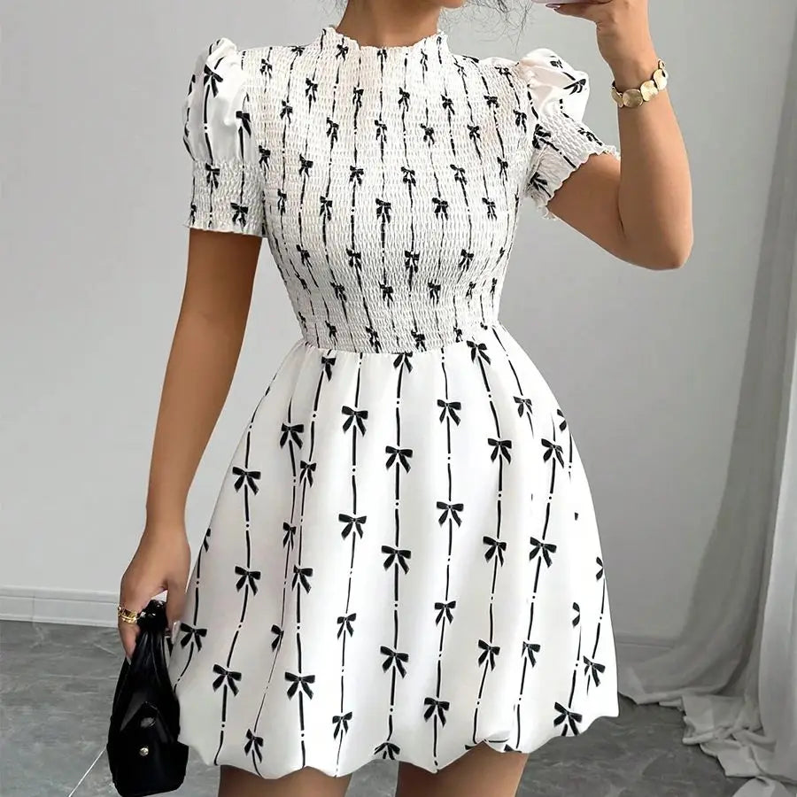 Summer European and American woven drawstring dress with short sleeves and waist cinching mid length skirt